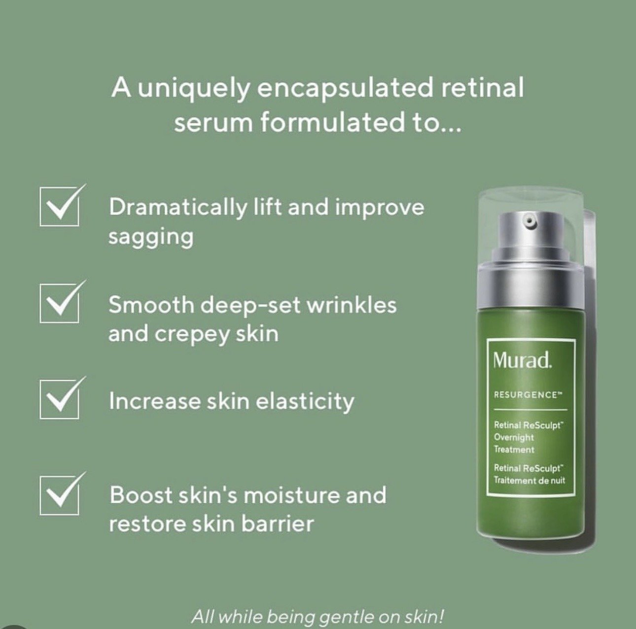 Uniquely encapsulated retinal serum that dramatically lifts and improves sagging, smooths deep-set wrinkles and increases skin elasticity.